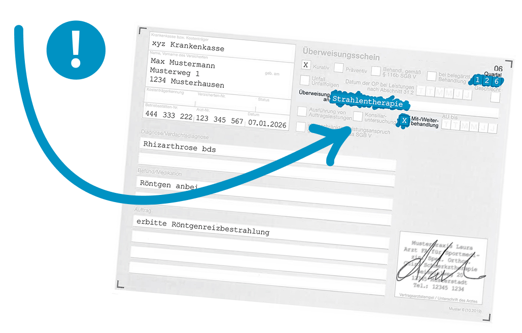 Sie haben einen Überweisungsschein von Ihrem Hausarzt, Orthopäden oder einem anderen Facharzt für eine Strahlentherapie erhalten.